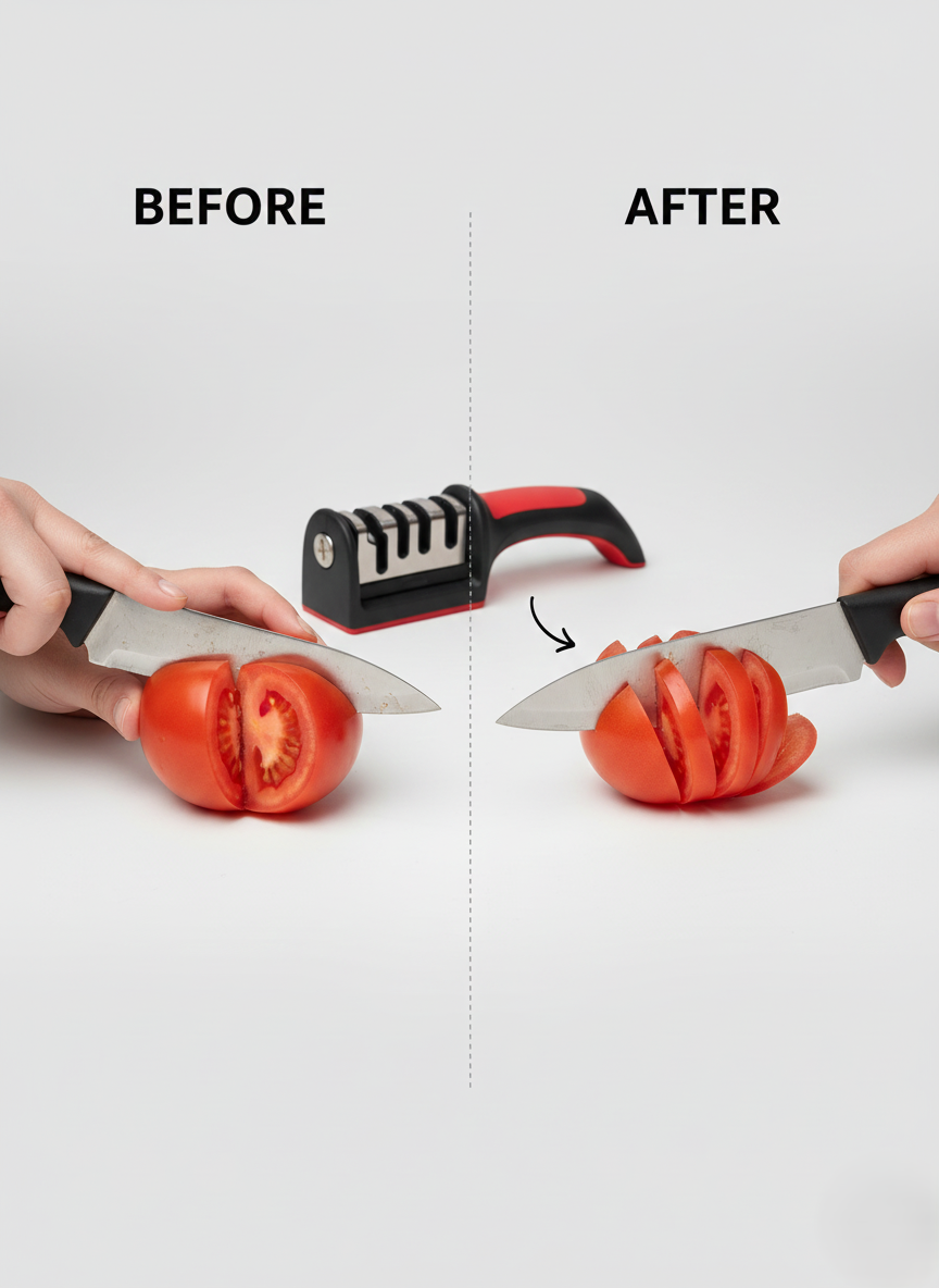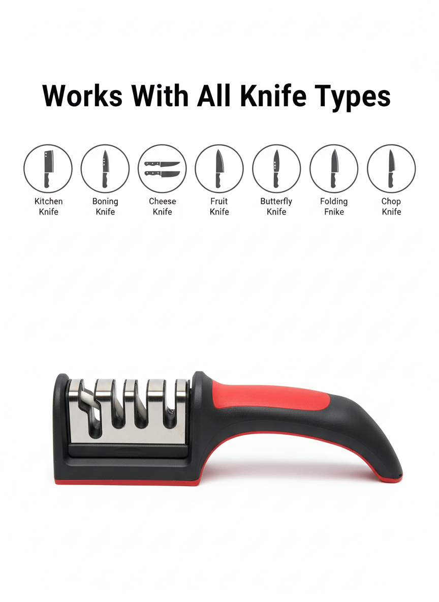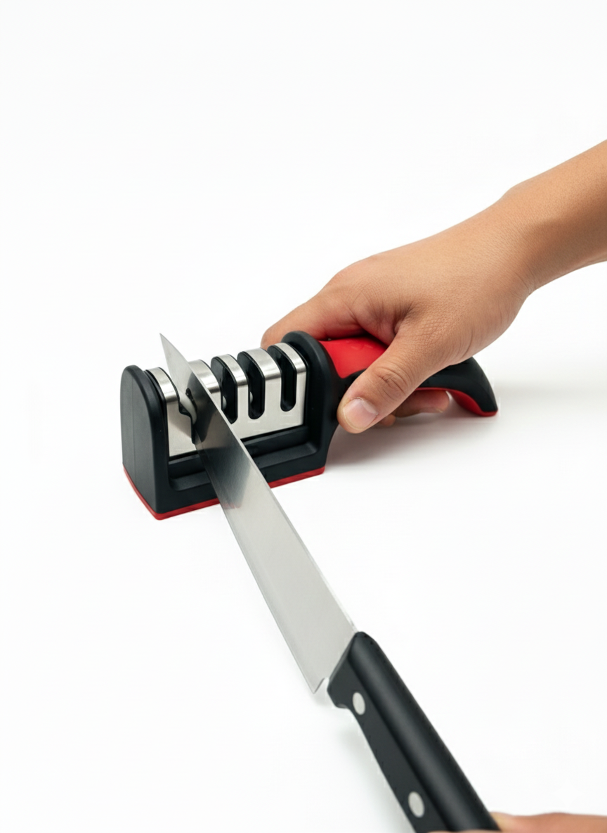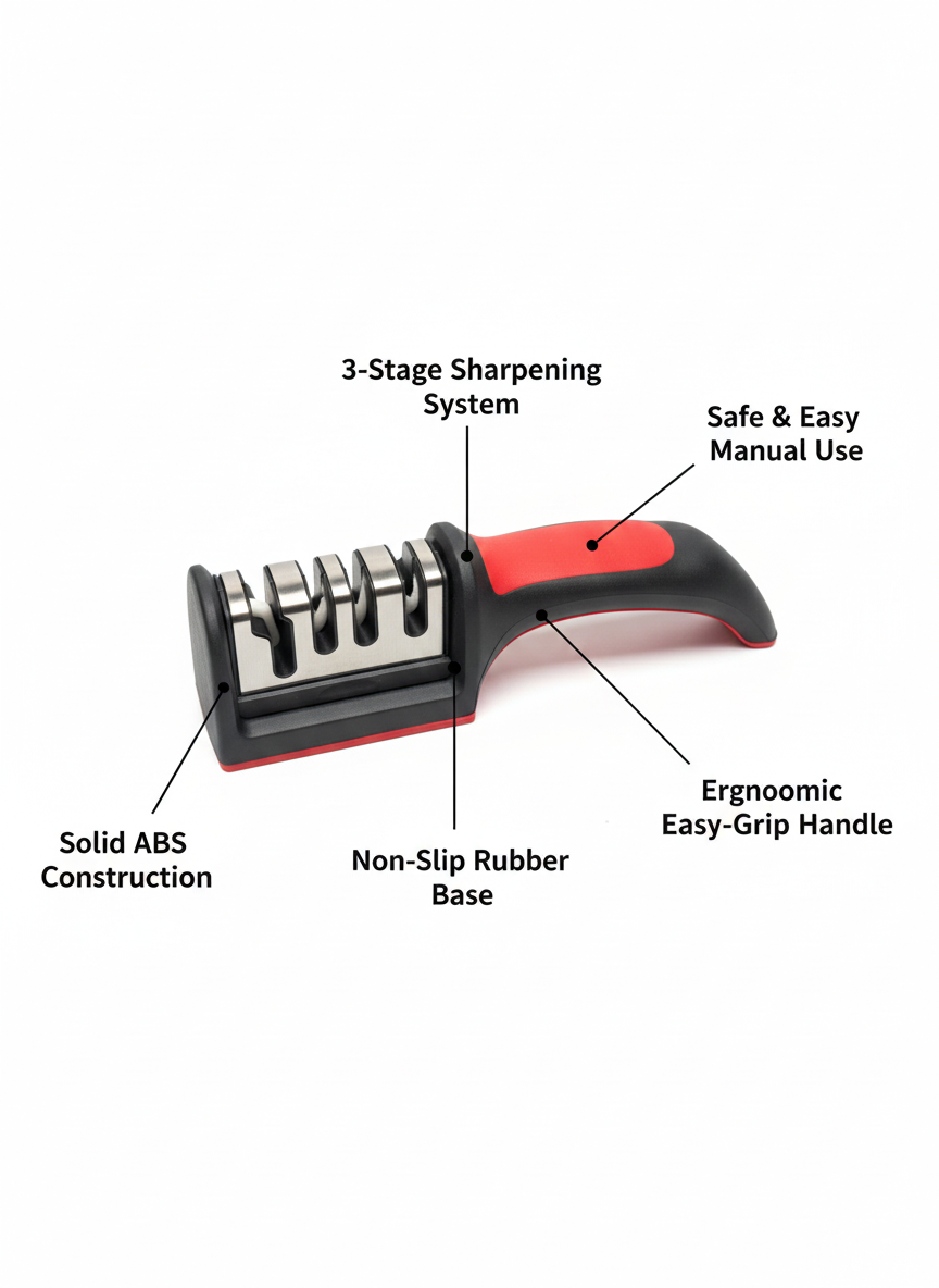The 3 stage manual knife sharpener is a must-have kitchen tool designed to keep your knives sharp, safe, and ready for everyday cooking. Dull knives make cutting slow and unsafe, while this sharpener restores blade sharpness in just a few easy strokes.