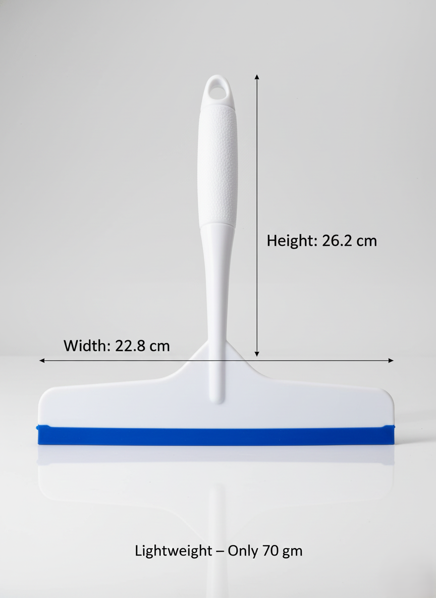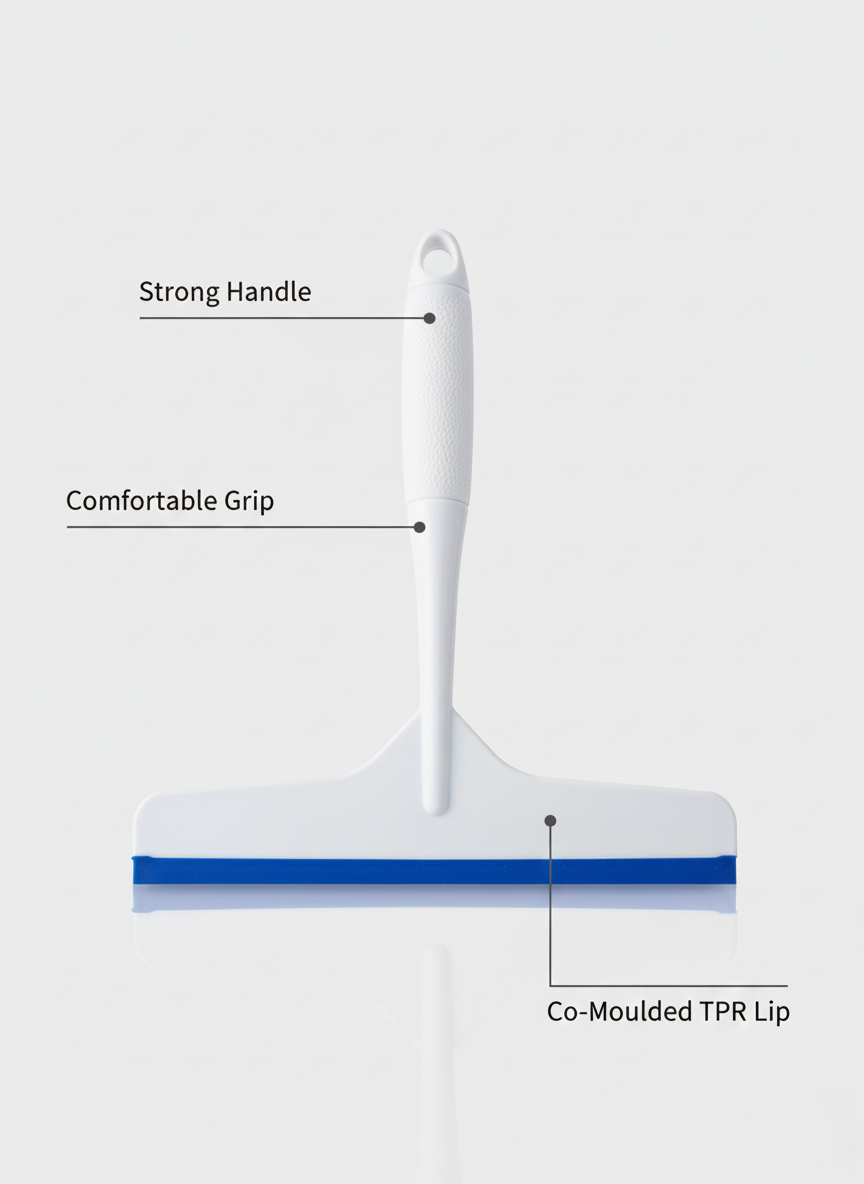 The co-moulded TPR rubber lip glides smoothly across wet surfaces, removing water, soap residue, and spills in a single swipe. The lightweight yet sturdy plastic body provides durability while remaining easy to handle for everyday use.
