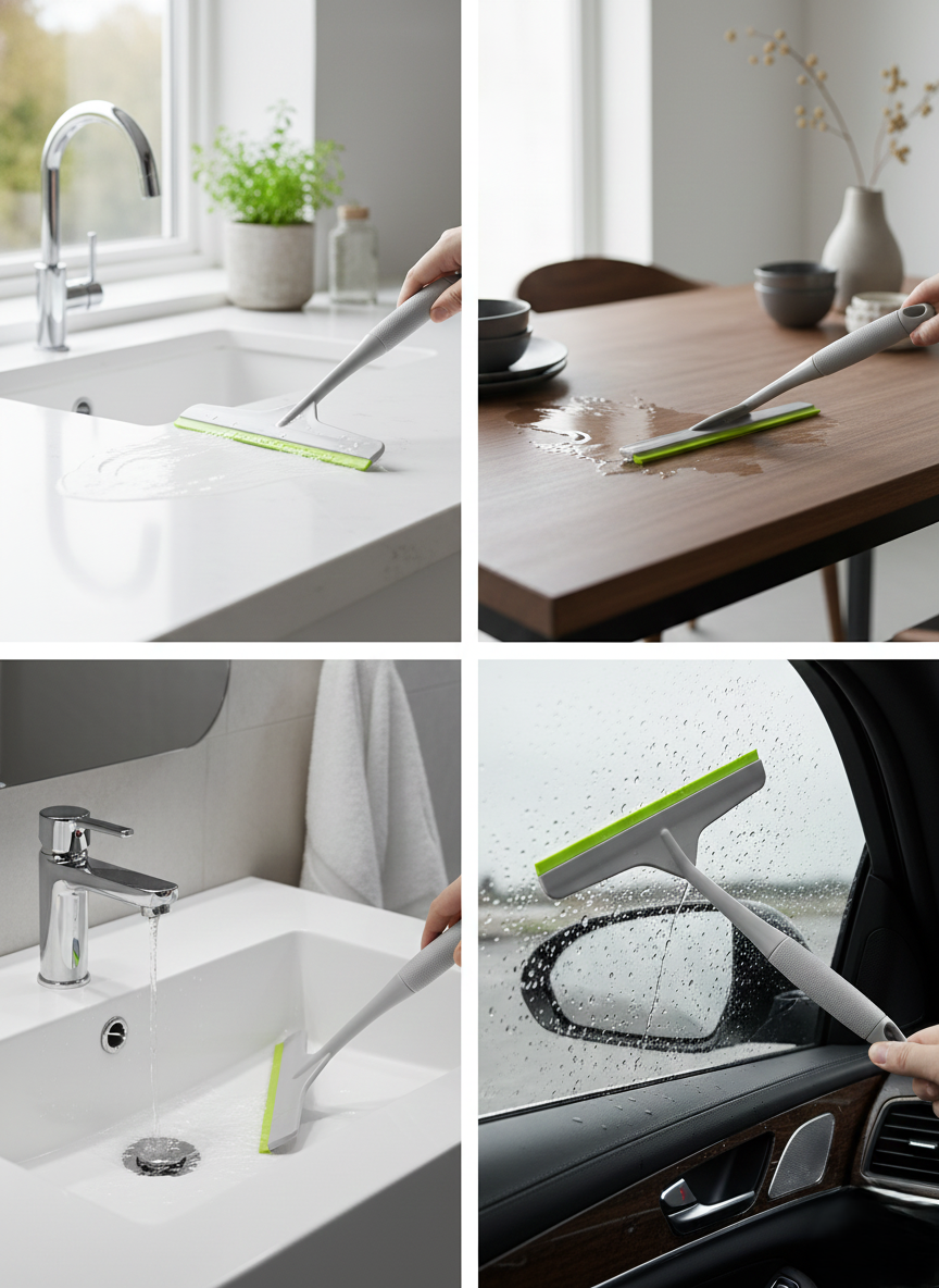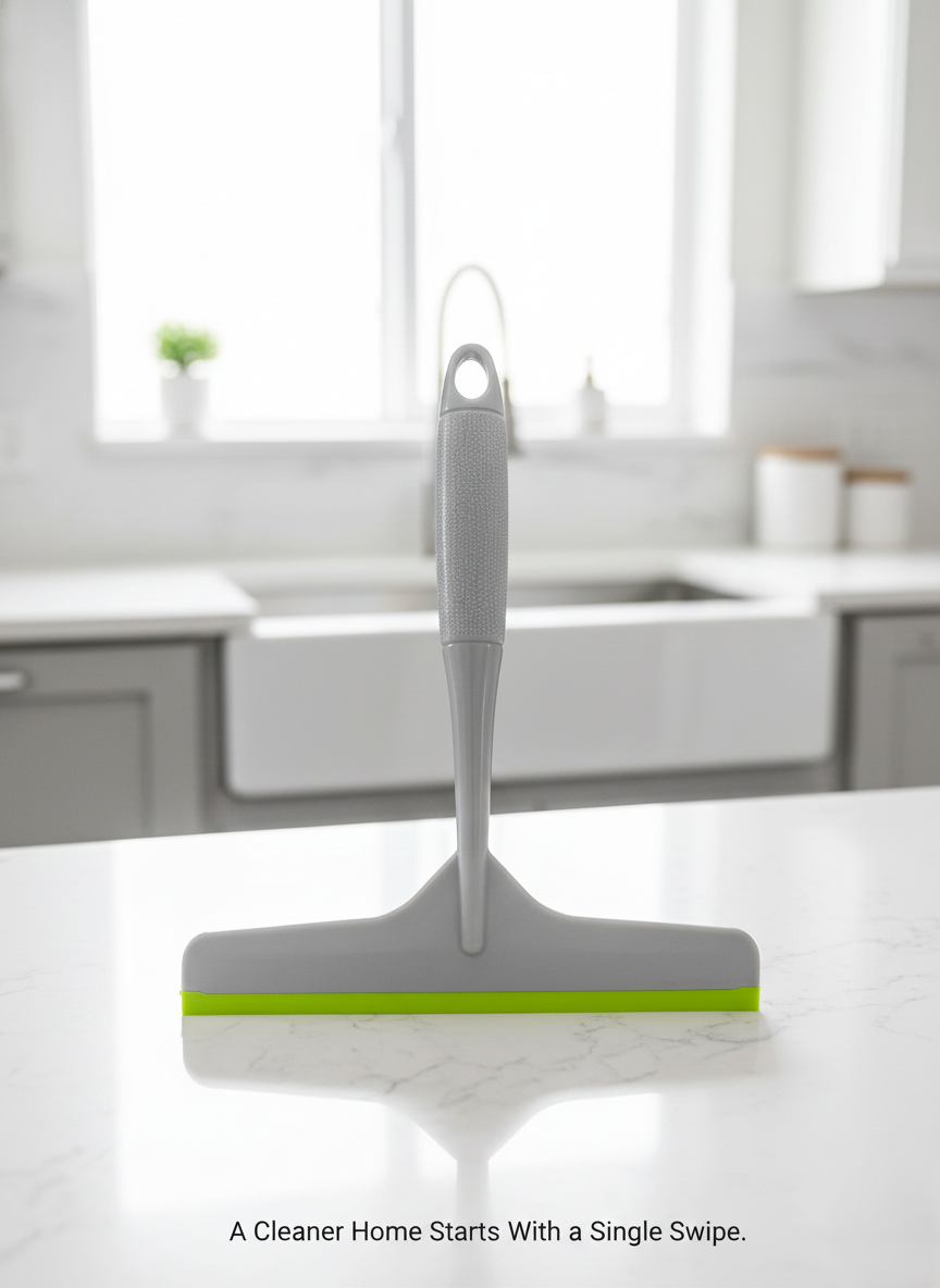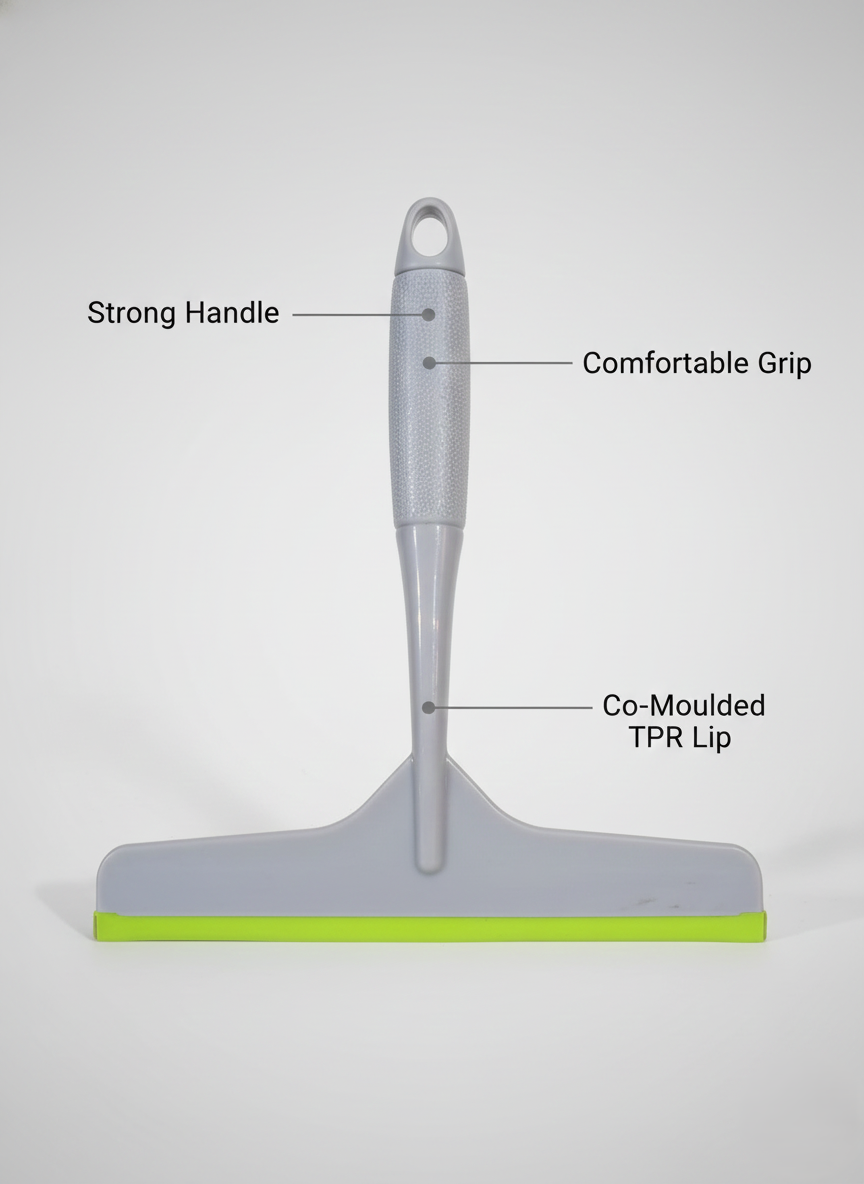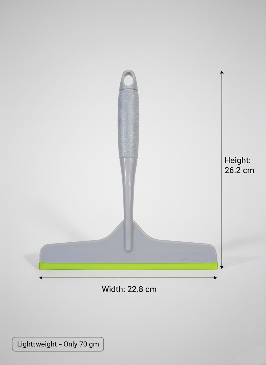 Built using high-quality plastic and a co-moulded soft TPR lip, the wiper glides smoothly across surfaces, removing water, soap residue, and spills without scratching or leaving marks. The soft rubber edge ensures gentle contact with delicate surfaces such as glass, tiles, and mirrors, making it safe for daily use.